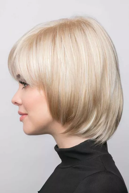 Peluca Shannon es de corte bob más escalada de los laterales y más larga de atrás, con flequillo desfilado.